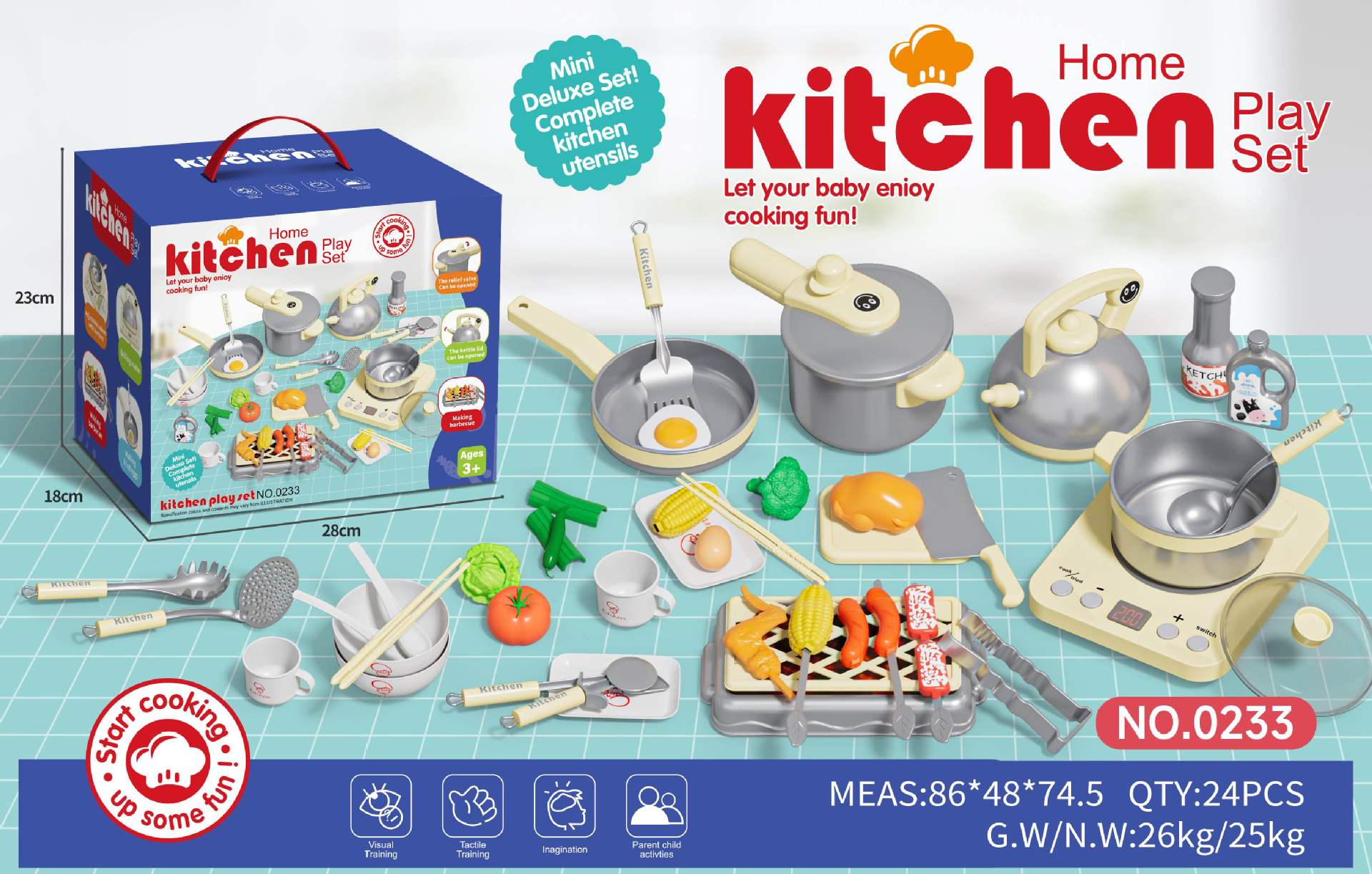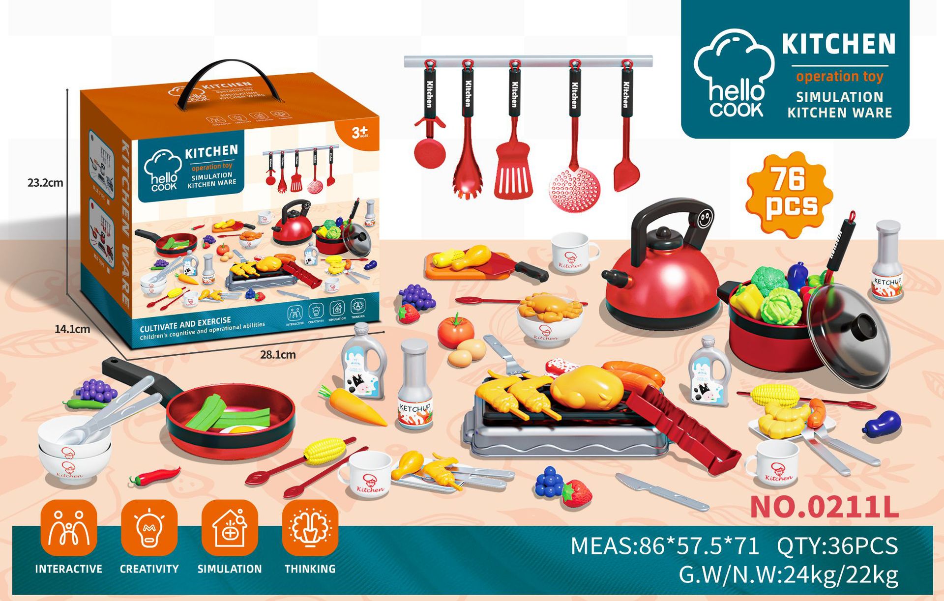 Simulation Kitchen Set: Realistic design with 76 pieces including fruits, vegetables, and a multifunctional induction cooker for immersive play.